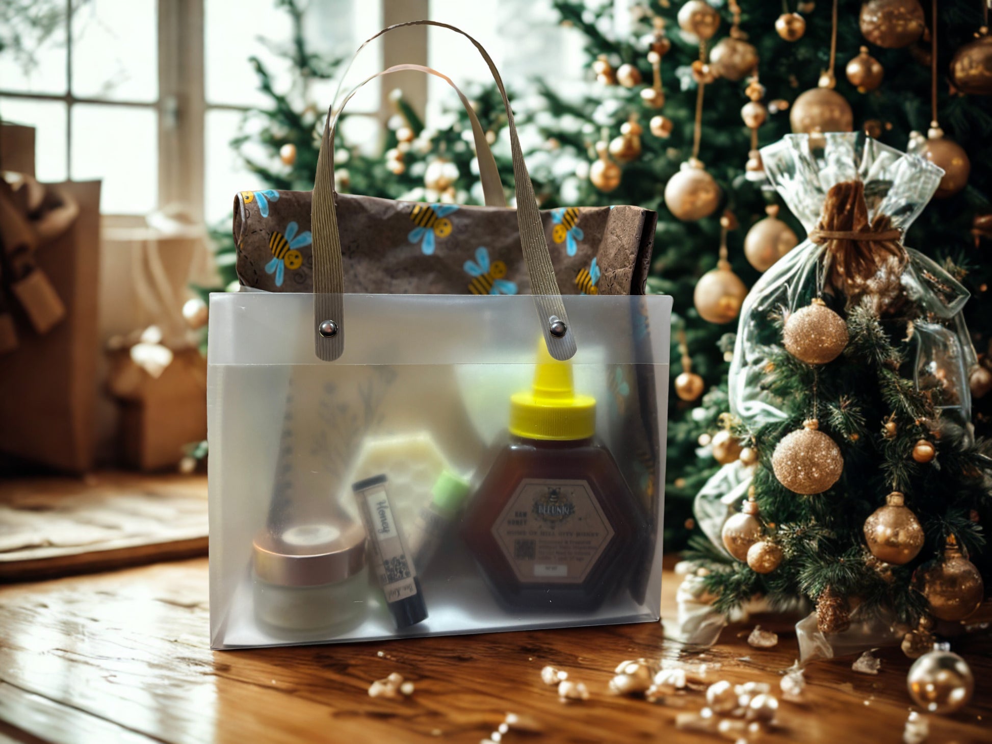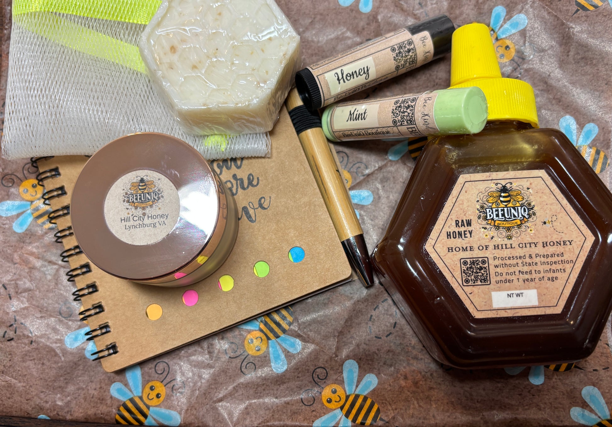 Inside this frosted bee inspired mix is a delicious 10-oz hexagon bottle of honey, two hydrating beeswax lip balms, a honey hand balm, bee soap, and an inspiring note pad to put those thoughts on paper. Treat yourself and a loved one with a thoughtful gift of true nature.
